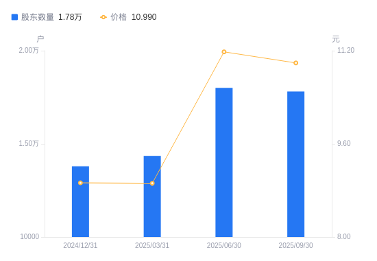 10月27日消息,数据显示,截至2025年9月30日,捷安高科A股股东总户数为1.78万户,较上期(2025年6月30日)减少192户,降幅1.07%。公司最新A股总股本为2.05亿股,其中流通A股1.44亿股,户均持有流通A股数量为8084.25股,较上期增加165.26股,增幅2.09%;户均持流通A股市值8.88万元,较上期增加311.57元,增幅0.35%。