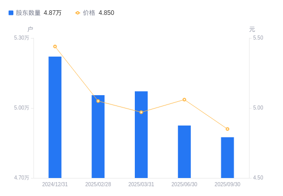 近一年(2024年9月30日至2025年9月30日),赣粤高速A股股东户数从5.49万户,减低至4.87万户,降幅11.23%,区间股价上涨2.75%。