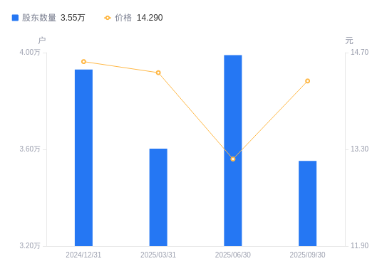 近一年(2024年9月30日至2025年9月30日),太阳纸业A股股东户数从4.1万户,减低至3.55万户,降幅13.42%,区间股价上涨2.51%。