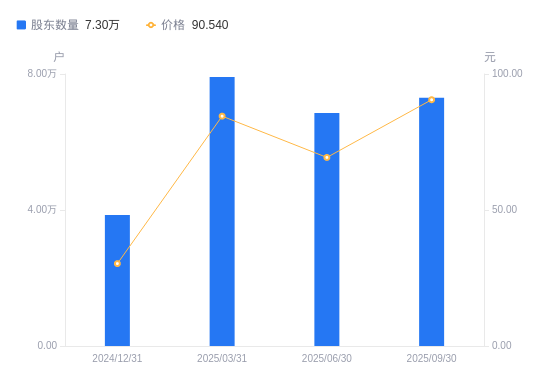 近一年(2024年9月30日至2025年9月30日),长盛轴承A股股东户数从1.52万户,增加至7.3万户,增幅379.21%,区间股价上涨537.52%。