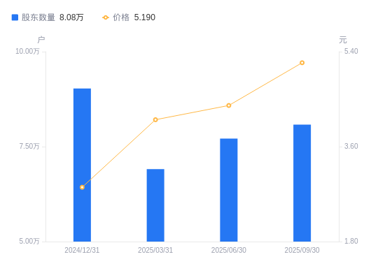近一年(2024年9月30日至2025年9月30日),中孚实业A股股东户数从8.44万户,减低至8.08万户,降幅4.34%,区间股价上涨87.36%。