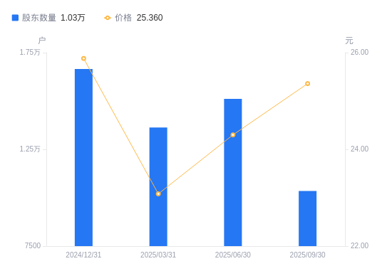 近一年(2024年9月30日至2025年9月30日),凡拓数创A股股东户数从1.36万户,减低至1.03万户,降幅24.02%,区间股价上涨26.74%。