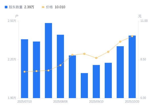 近一年(2024年10月31日至2025年10月20日),中辰股份A股股东户数从2.01万户,增加至2.39万户,增幅18.48%,区间股价上涨48.96%。