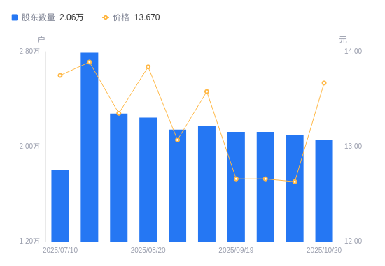 近一年(2024年12月10日至2025年10月20日),晨光新材A股股东户数从2.4万户,减低至2.06万户,降幅14.14%,区间股价上涨2.55%。