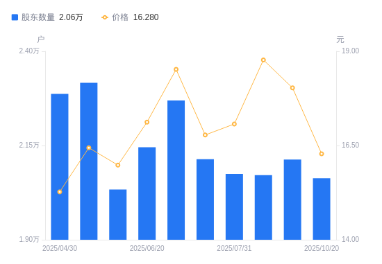 近一年(2024年10月31日至2025年10月20日),达利凯普A股股东户数从1.23万户,增加至2.06万户,增幅67.94%,区间股价下跌16.13%。