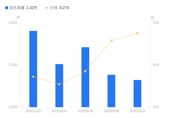 近一年(2024年9月30日至2025年9月30日),星徽股份A股股东户数从2.32万户,增加至2.38万户,增幅2.67%,区间股价上涨82.12%。