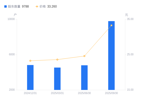近一年(2024年9月30日至2025年9月30日),倍加洁A股股东户数从5052户,增加至9788户,增幅93.75%,区间股价上涨64.57%。