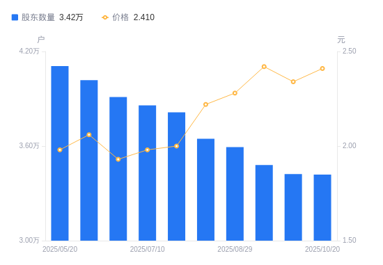 近一年(2024年9月30日至2025年9月30日),*ST宝鹰A股股东户数从4.53万户,减低至3.42万户,降幅24.45%,区间股价上涨33.71%。