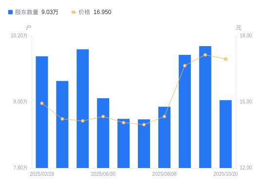 近一年(2024年11月20日至2025年10月20日),大港股份A股股东户数从11.76万户,减低至9.03万户,降幅23.22%,区间股价上涨4.69%。
