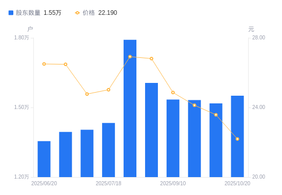 近一年(2024年10月31日至2025年10月20日),蓝盾光电A股股东户数从1.89万户,减低至1.55万户,降幅17.75%,区间股价下跌36.89%。