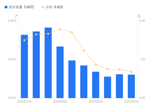 近一年(2024年10月31日至2025年10月20日),万达信息A股股东户数从5.64万户,增加至5.8万户,增幅2.84%,区间股价下跌16.11%。
