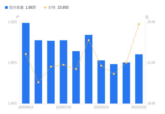 近一年(2024年10月31日至2025年10月20日),腾达科技A股股东户数从2.64万户,减低至1.88万户,降幅28.56%,区间股价下跌2.45%。