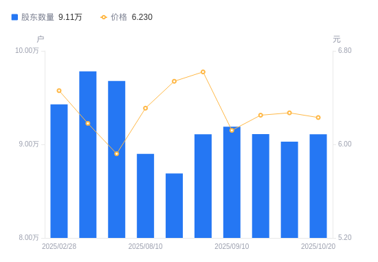 近一年(2024年12月31日至2025年10月20日),远光软件A股股东户数从7.81万户,增加至9.11万户,增幅16.68%,区间股价上涨2.98%。