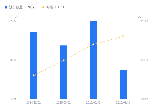 近一年(2024年9月30日至2025年9月30日),蔚蓝生物A股股东户数从2.36万户,减低至1.7万户,降幅28.00%,区间股价上涨17.31%。
