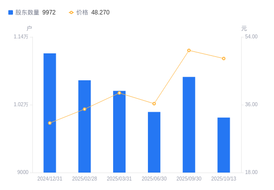 近一年(2024年9月30日至2025年9月30日),西典新能A股股东户数从1.54万户,减低至1.07万户,降幅30.62%,区间股价上涨74.77%。