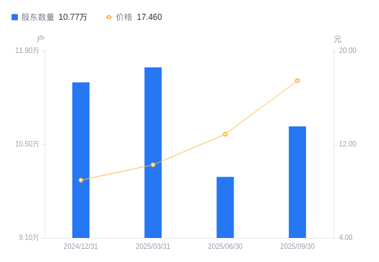 近一年(2024年9月30日至2025年9月30日),永太科技A股股东户数从12.52万户,减低至10.77万户,降幅13.95%,区间股价上涨95.74%。