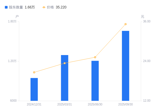 10月28日消息,数据显示,截至2025年9月30日,南方路机A股股东总户数为1.66万户,较上期(2025年6月30日)增加4531户,增幅37.59%。公司最新A股总股本为1.08亿股,其中流通A股2794.17万股,户均持有流通A股数量为1684.65股,较上期减少633.2股,降幅27.32%;户均持流通A股市值5.93万元,较上期增加946.89元,增幅1.62%。