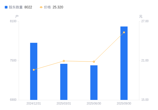 近一年(2024年9月30日至2025年9月30日),交控科技A股股东户数从7649户,增加至8022户,增幅4.88%,区间股价上涨55.05%。