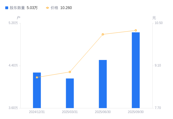近一年(2024年9月30日至2025年9月30日),德生科技A股股东户数从4.04万户,增加至5.03万户,增幅24.44%,区间股价上涨23.30%。