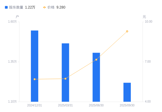 近一年(2024年9月30日至2025年9月30日),ST智知A股股东户数从1.85万户,减低至1.22万户,降幅34.08%,区间股价上涨86.05%。