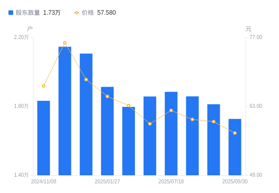 近一年(2024年9月30日至2025年9月30日),亚康股份A股股东户数从1.73万户,增加至1.73万户,增幅0.09%,区间股价上涨24.01%。