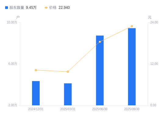 近一年(2024年9月30日至2025年9月30日),东信和平A股股东户数从4.6万户,增加至9.45万户,增幅105.55%,区间股价上涨144.67%。