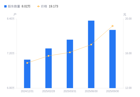 近一年(2024年9月30日至2025年9月30日),信达证券A股股东户数从6.62万户,增加至8.02万户,增幅21.11%,区间股价上涨24.59%。