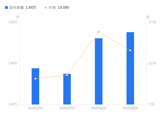 近一年(2024年9月30日至2025年9月30日),菜百股份A股股东户数从1.43万户,增加至1.84万户,增幅28.27%,区间股价上涨37.60%。