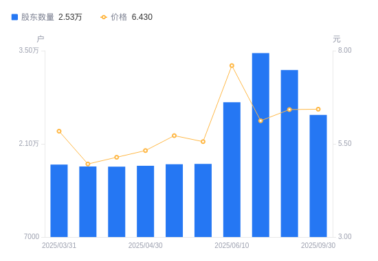 近一年(2024年9月30日至2025年9月30日),金鹰股份A股股东户数从1.99万户,增加至2.53万户,增幅27.52%,区间股价上涨36.81%。