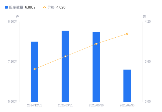 近一年(2024年9月30日至2025年9月30日),远大智能A股股东户数从7.37万户,减低至6.89万户,降幅6.51%,区间股价上涨36.27%。