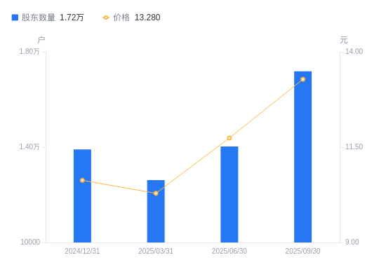 近一年(2024年9月30日至2025年9月30日),四方新材A股股东户数从1.35万户,增加至1.72万户,增幅27.33%,区间股价上涨36.63%。