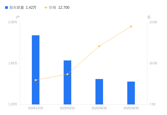 近一年(2024年9月30日至2025年9月30日),岱勒新材A股股东户数从1.84万户,减低至1.42万户,降幅22.79%,区间股价上涨95.08%。