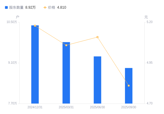 近一年(2024年9月30日至2025年9月30日),苏能股份A股股东户数从11.9万户,减低至8.92万户,降幅25.01%,区间股价下跌7.46%。
