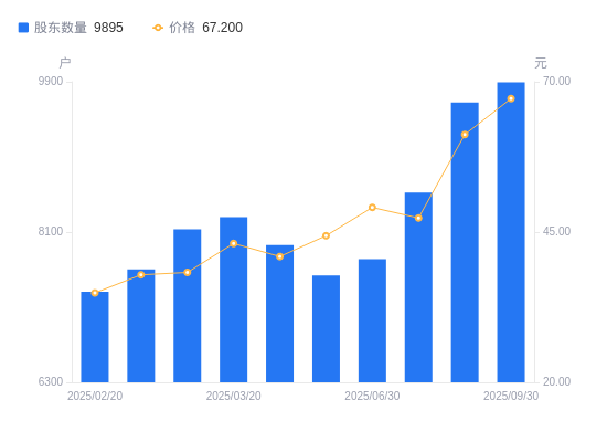 近一年(2024年9月30日至2025年9月30日),日联科技A股股东户数从6704户,增加至9895户,增幅47.60%,区间股价上涨119.40%。