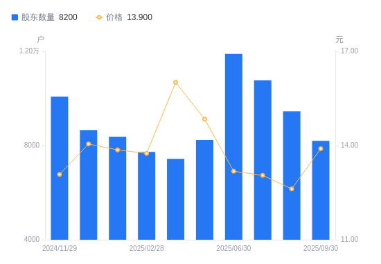 近一年(2024年9月30日至2025年9月30日),锦盛新材A股股东户数从7709户,增加至8200户,增幅6.37%,区间股价上涨0.94%。