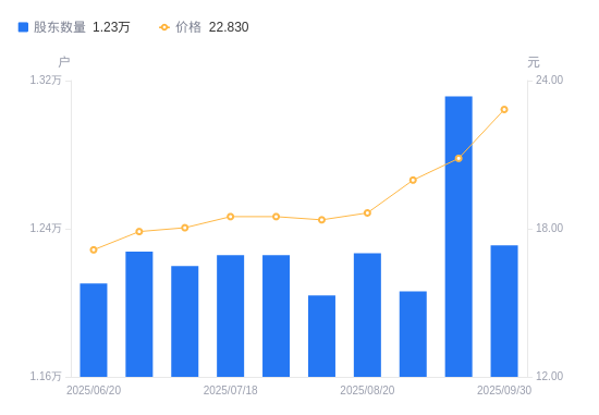 近一年(2024年9月30日至2025年9月30日),元利科技A股股东户数从1.35万户,减低至1.23万户,降幅8.86%,区间股价上涨64.19%。