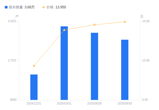 近一年(2024年9月30日至2025年9月30日),金奥博A股股东户数从1.89万户,增加至3.66万户,增幅93.24%,区间股价上涨64.47%。