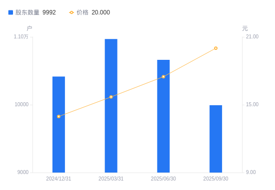 近一年(2024年9月30日至2025年9月30日),德宏股份A股股东户数从1.29万户,减低至9992户,降幅22.66%,区间股价上涨68.21%。