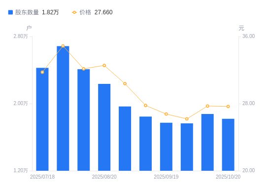 10月28日消息,数据显示,截至2025年9月30日,邵阳液压A股股东总户数为1.76万户,较上期(2025年9月19日)减少71户,降幅0.40%。公司最新A股总股本为1.09亿股,其中流通A股6952.52万股,户均持有流通A股数量为3940.67股,较上期增加15.79股,增幅0.40%;户均持流通A股市值10.32万元,较上期减少1862.92元,降幅1.77%。