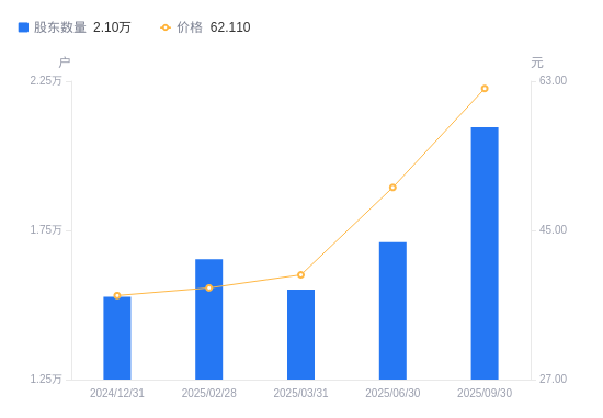 10月28日消息,数据显示,截至2025年9月30日,炬芯科技A股股东总户数为2.1万户,较上期(2025年6月30日)增加3858户,增幅22.56%。公司最新A股总股本为1.75亿股,其中流通A股1.75亿股,户均持有流通A股数量为8357.24股,较上期减少187.75股,降幅2.20%;户均持流通A股市值51.91万元,较上期增加9.03万元,增幅21.05%。