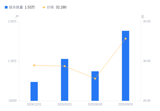 近一年(2024年9月30日至2025年9月30日),安路科技A股股东户数从1.04万户,增加至1.53万户,增幅46.51%,区间股价上涨52.19%。