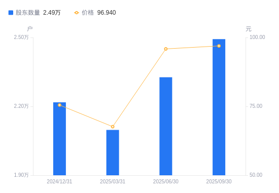 10月28日消息,数据显示,截至2025年9月30日,联特科技A股股东总户数为2.49万户,较上期(2025年6月30日)增加1661户,增幅7.14%。公司最新A股总股本为1.3亿股,其中流通A股6795.83万股,户均持有流通A股数量为2725.96股,较上期减少194.59股,降幅6.66%;户均持流通A股市值26.43万元,较上期减少1.57万元,降幅5.61%。