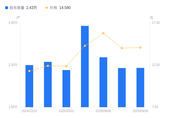 近一年(2024年9月30日至2025年9月30日),贵航股份A股股东户数从2.79万户,减低至2.43万户,降幅12.74%,区间股价上涨27.25%。