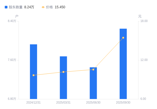 近一年(2024年9月30日至2025年9月30日),金钼股份A股股东户数从7.28万户,增加至8.24万户,增幅13.30%,区间股价上涨45.75%。