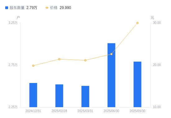 近一年(2024年9月30日至2025年9月30日),金雷股份A股股东户数从2.96万户,减低至2.79万户,降幅5.80%,区间股价上涨70.78%。