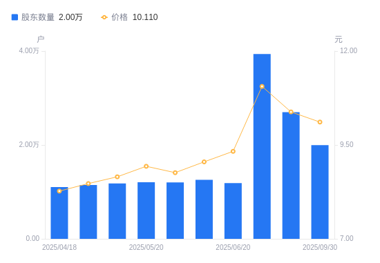 10月28日消息,数据显示,截至2025年9月30日,新通联(维权)A股股东总户数为2万户,较上期(2025年7月10日)减少6994户,降幅25.93%。公司最新A股总股本为2亿股,其中流通A股2亿股,户均持有流通A股数量为1万股,较上期增加2595.46股,增幅35.01%;户均持流通A股市值10.12万元,较上期增加2.42万元,增幅31.49%。