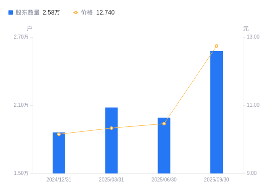 近一年(2024年9月30日至2025年9月30日),森霸传感A股股东户数从1.52万户,增加至2.58万户,增幅69.58%,区间股价上涨57.87%。