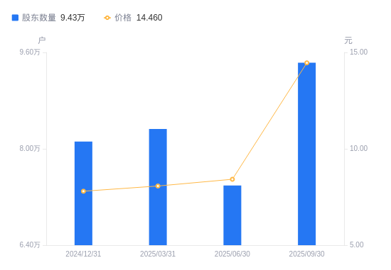 近一年(2024年9月30日至2025年9月30日),科森科技A股股东户数从7.59万户,增加至9.43万户,增幅24.22%,区间股价上涨73.17%。