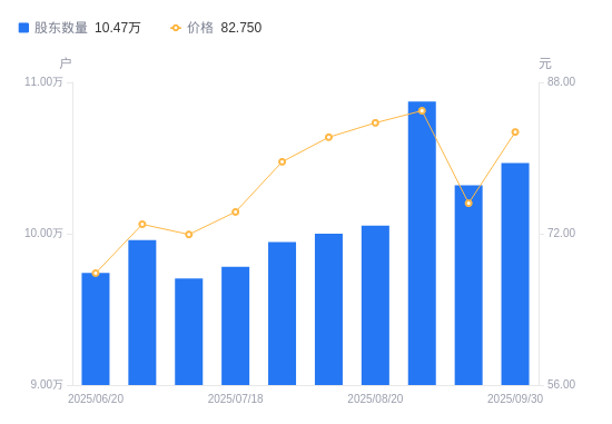 10月28日消息,数据显示,截至2025年9月30日,景嘉微A股股东总户数为10.47万户,较上期(2025年9月10日)增加1471户,增幅1.43%。公司最新A股总股本为5.23亿股,其中流通A股4.06亿股,户均持有流通A股数量为3883.5股,较上期减少55.36股,降幅1.41%;户均持流通A股市值32.14万元,较上期增加2.51万元,增幅8.46%。