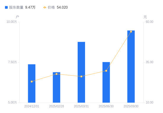 近一年(2024年9月30日至2025年9月30日),生益科技A股股东户数从9.61万户,减低至9.47万户,降幅1.41%,区间股价上涨196.98%。